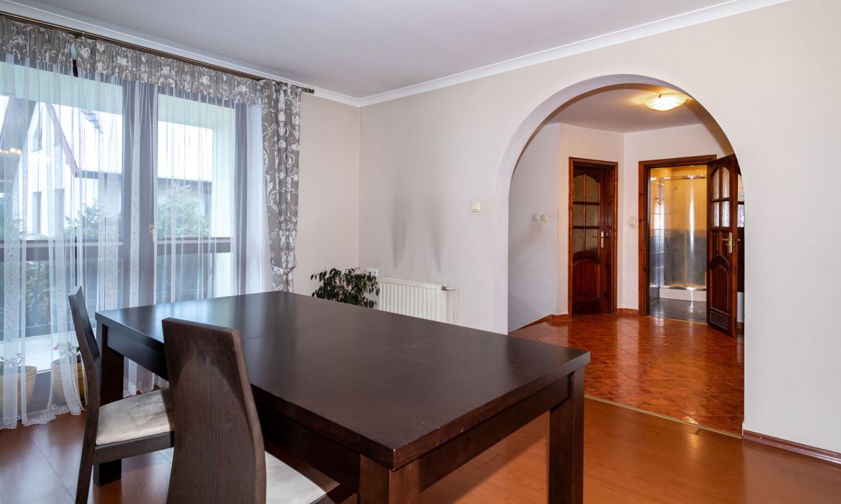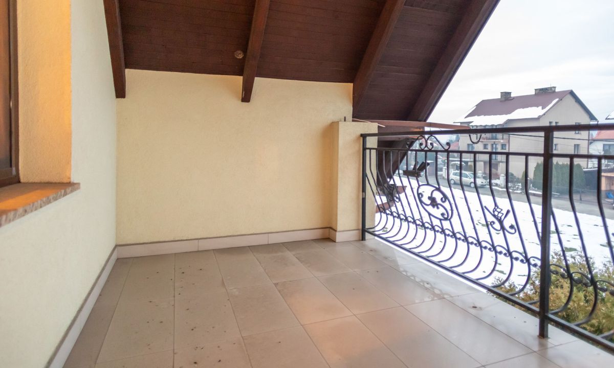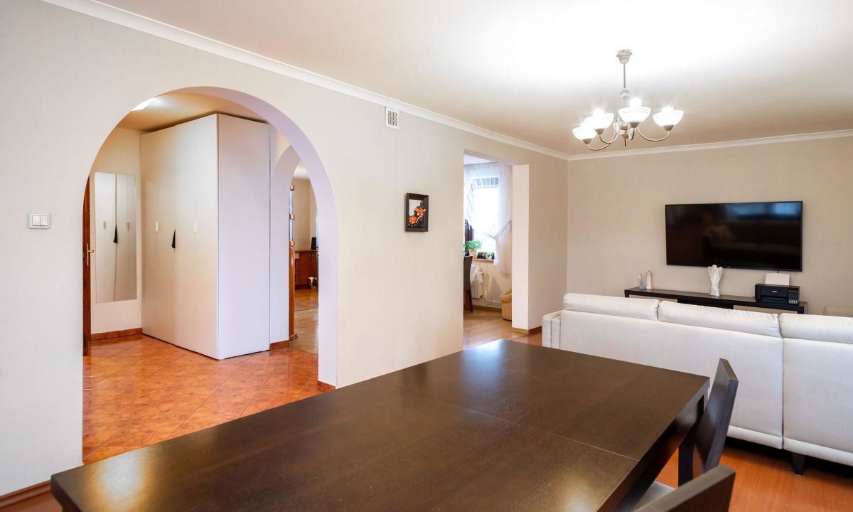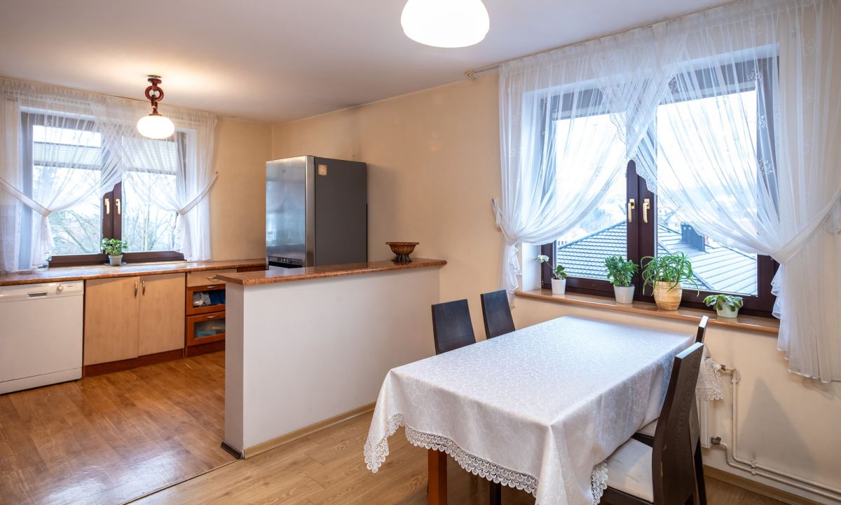 Na sześcio arowej działce w południowej części Bochni z wystawą południową znajduje się parterowy dom z użytkowym poddaszem, garażem o łącznej powierzchni użytkowej 155 m2.