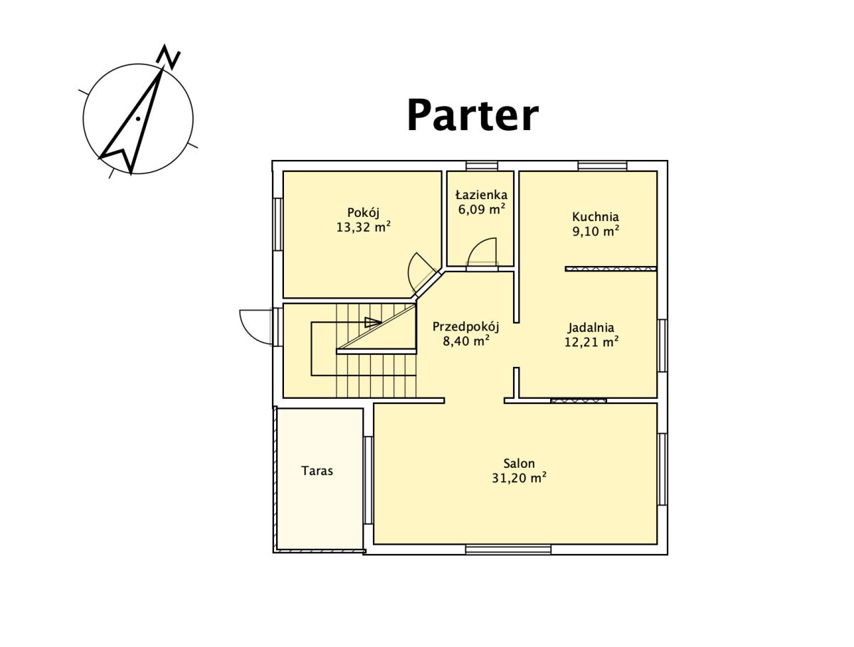 Budynek na parterze to otwarta przestrzeń z kuchnią, jadalnią i salonem o powierzchni 52 m2, jasny korytarz ze schodami o powierzchni 8 m2 i pokój, który może być sypialnią, gabinetem ( 13m) oraz łazienka z prysznicem.
