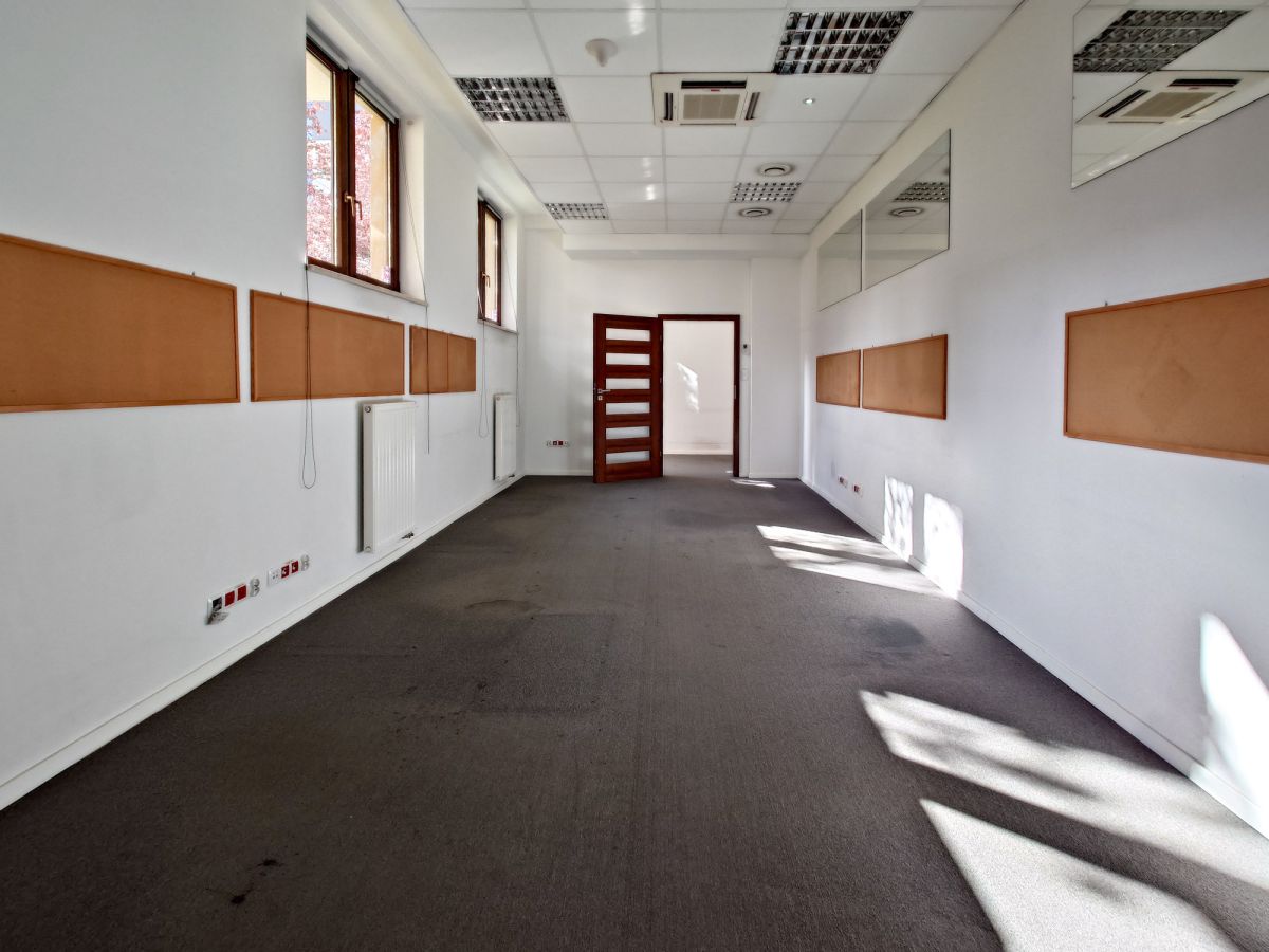 Powierzchnia 184,73 m2 podzielona w większości lekkimi ściankami. Dodatkowo pomieszczenie socjalne, serwerownia i dwie toalety. Obecny układ to: open - space z recepcją i 5 zamykanymi pomieszczemiami biurowymi + pom. gospodarcze (patrz rzut).