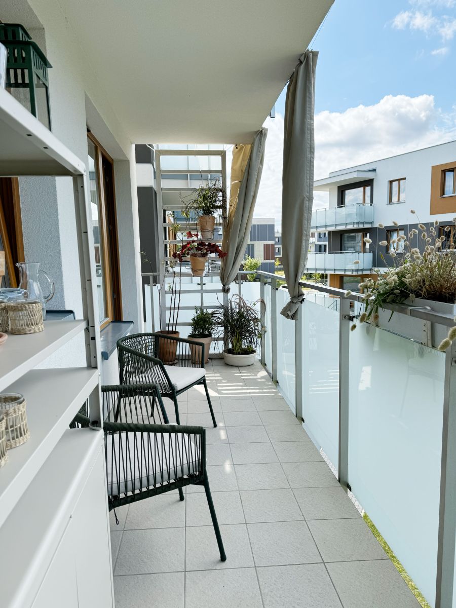 Dobrze rozplanowane i nowocześnie zaprojektowane 3 pokoje z obszerną łazienką, kuchnią otwartą na salon i wyjątkowo długim, ciągnącym się przez całe mieszkanie balkonem z widokiem na zieleń. Specjalnie do oferty dołączam zdjęcia balkonu robione latem.