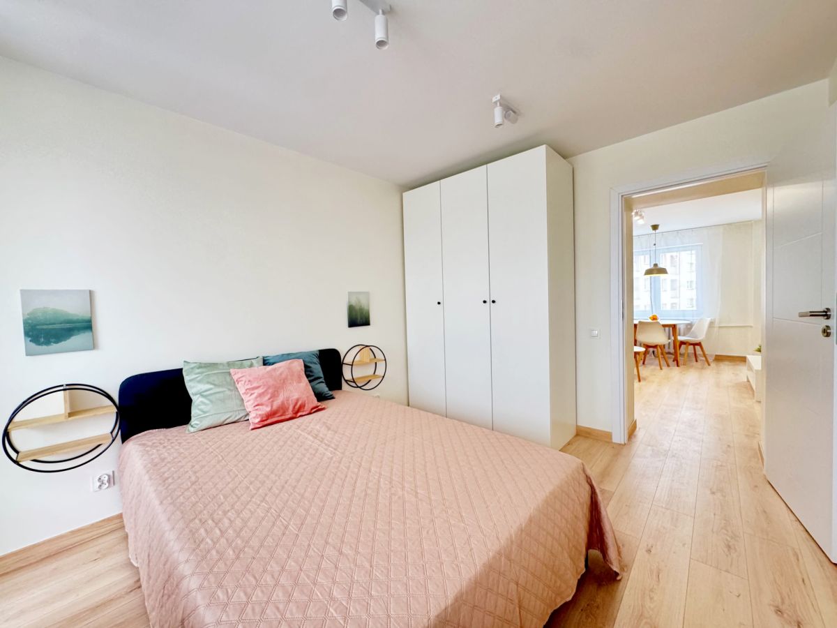 Sypialnia została wyposażona w duże, wygodne łóżko oraz pojemną szafę na ubrania.
