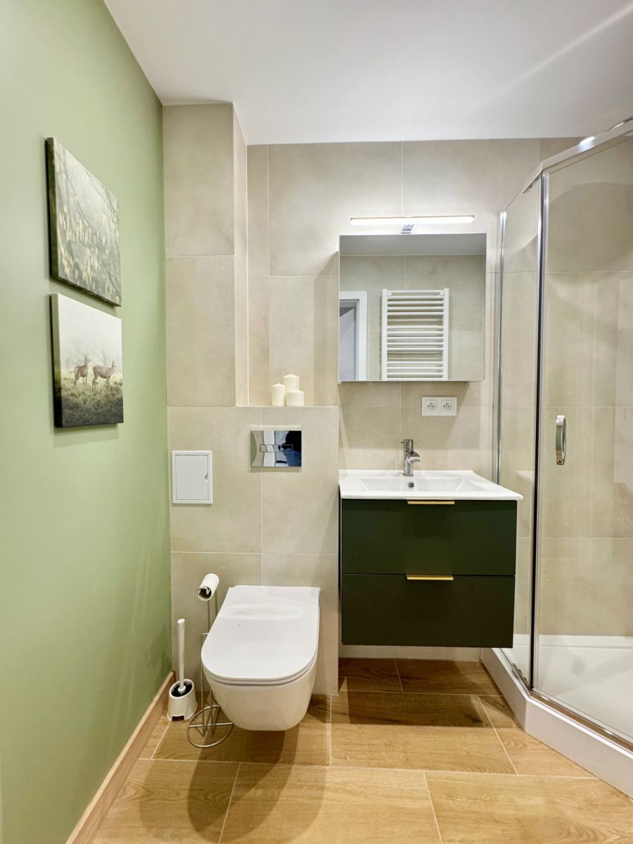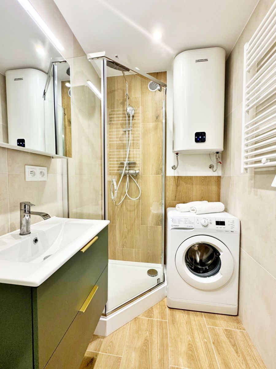 Łazienka jest nowoczesna i znajduje się w niej prysznic oraz pralka.