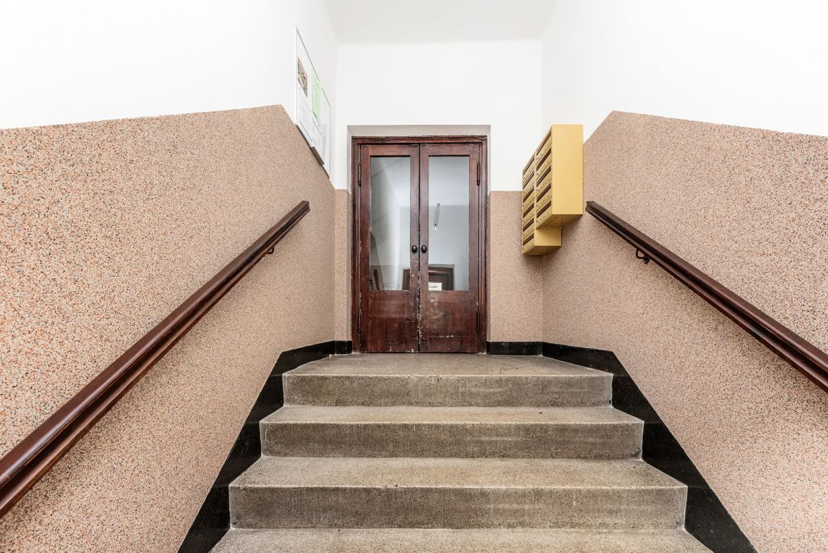 Okna wychodzą na zieleń przed budynkiem. Kamieniczka czysta i zadbana.