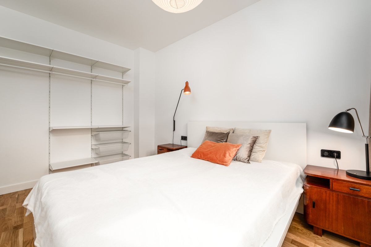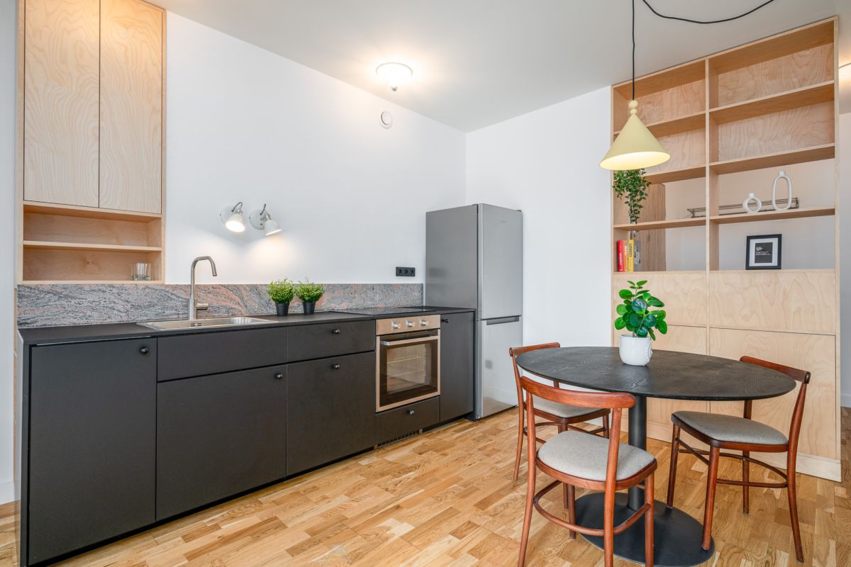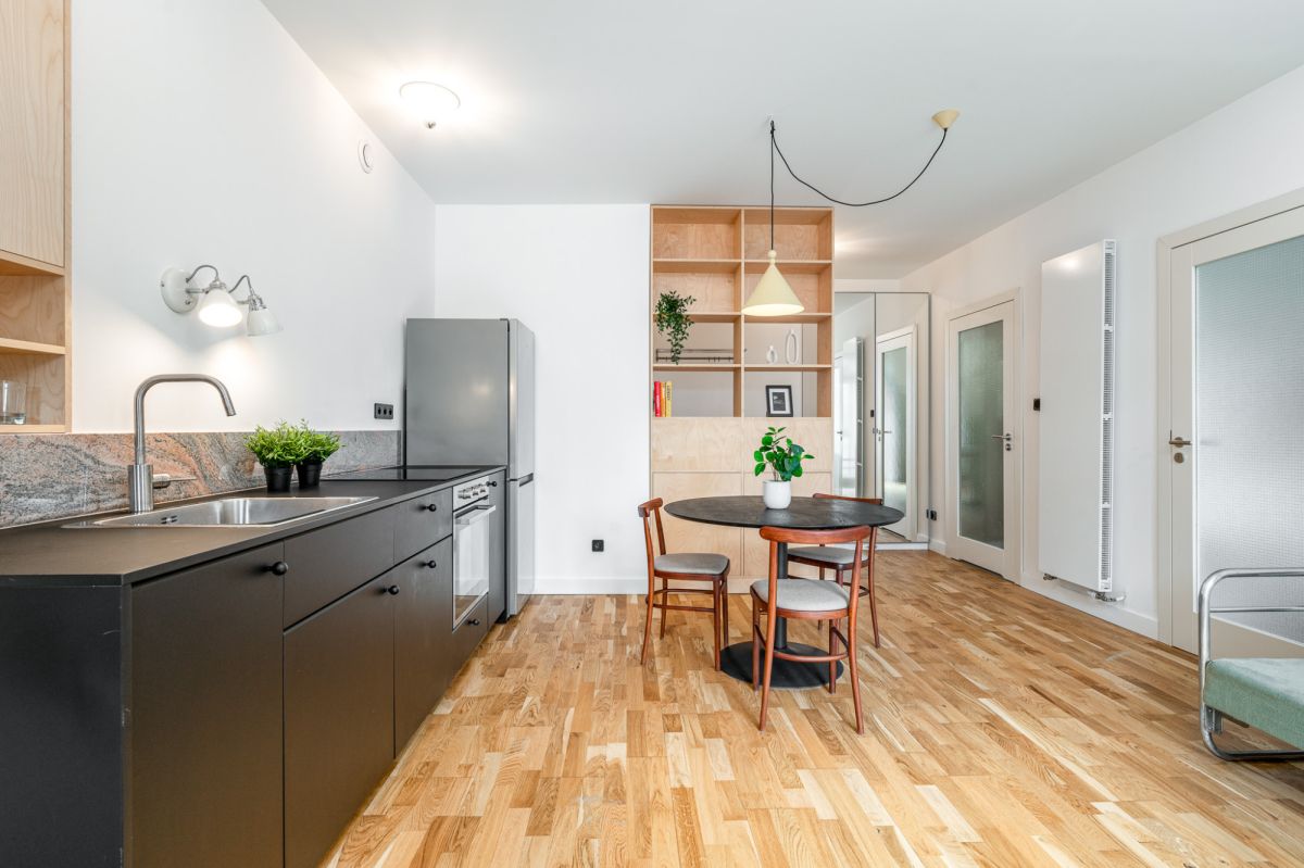 Mieszkanie jest designersko zaprojektowane z dbałością o każdy szczegół, może zadowolić konesera mebli mid-century - znajdziesz tu odnowione krzesła z fabryki mebli giętych z Radomska, stylizowane drzwi z przeszkleniami, oszczędną w formę łazienkę, sofę i wiele smaczków nadających temu miejscu indywidualnego charakteru.