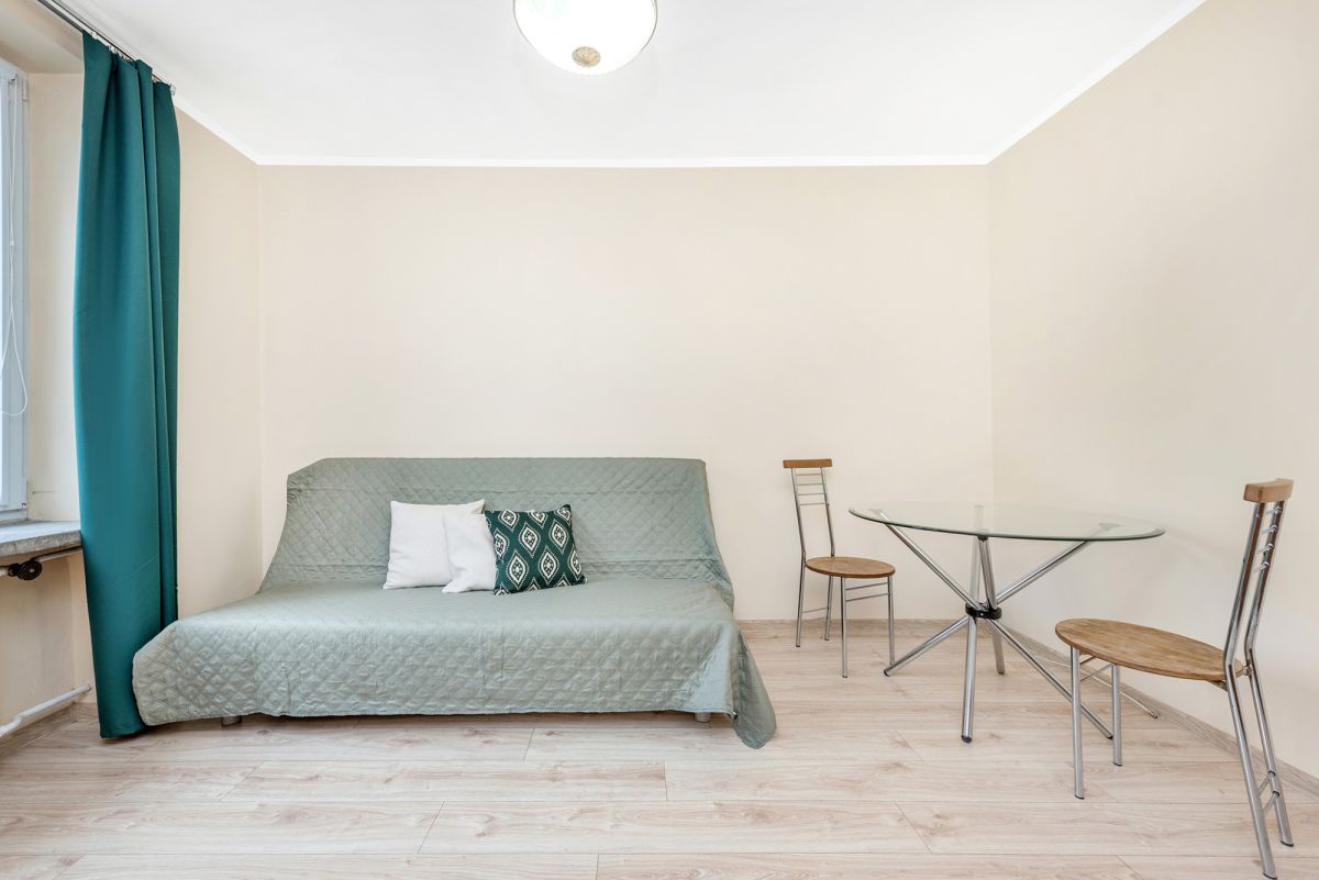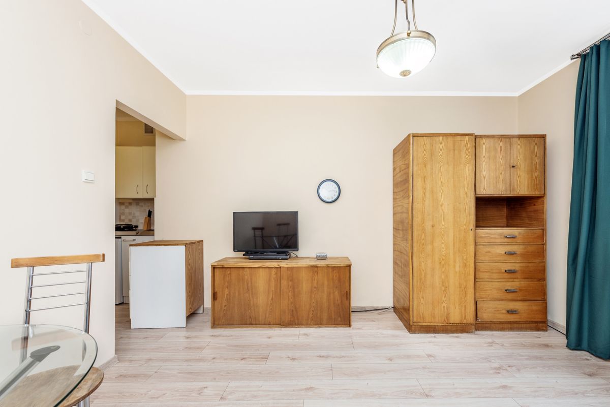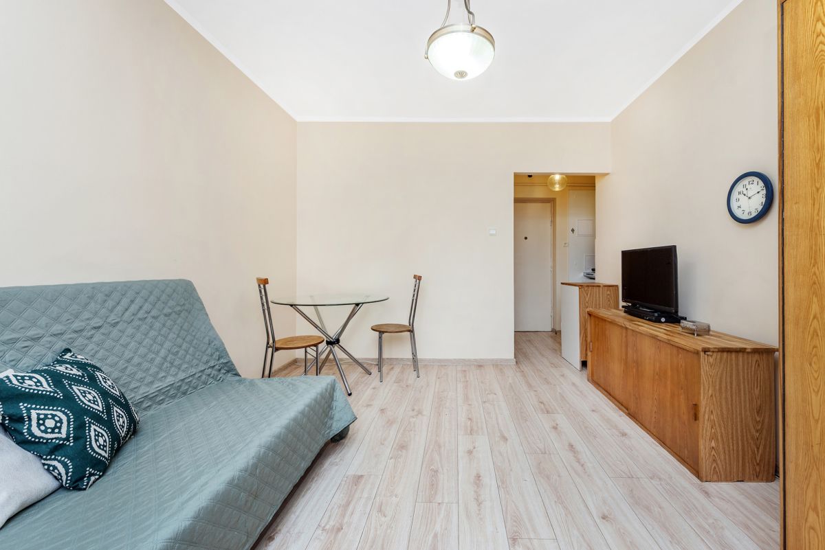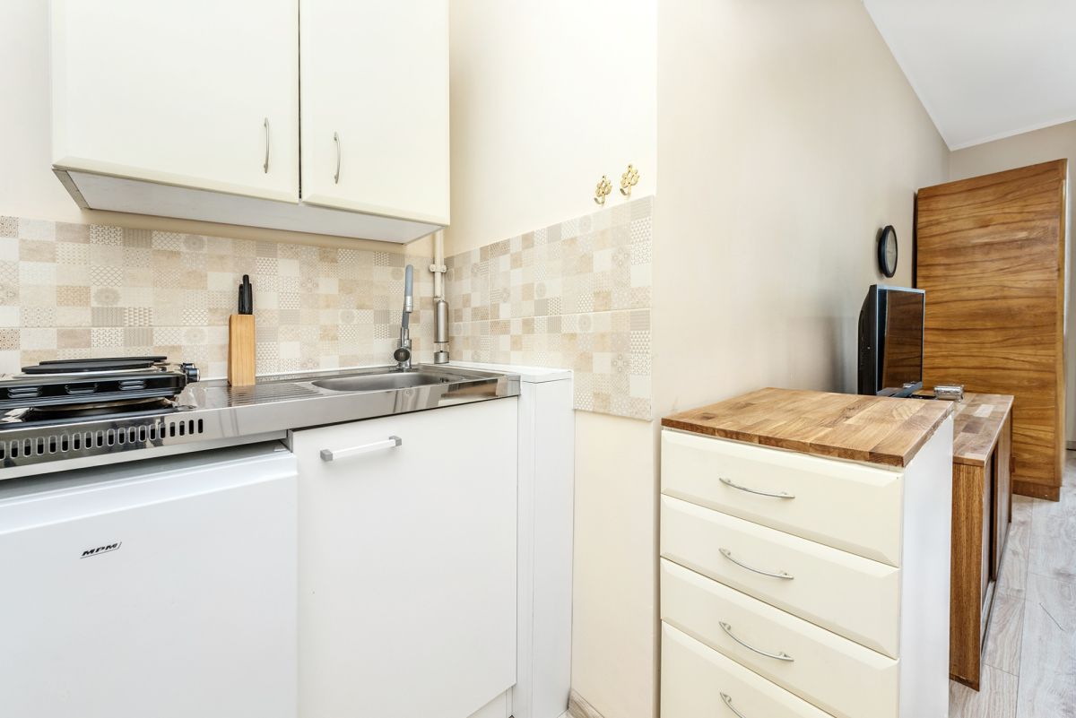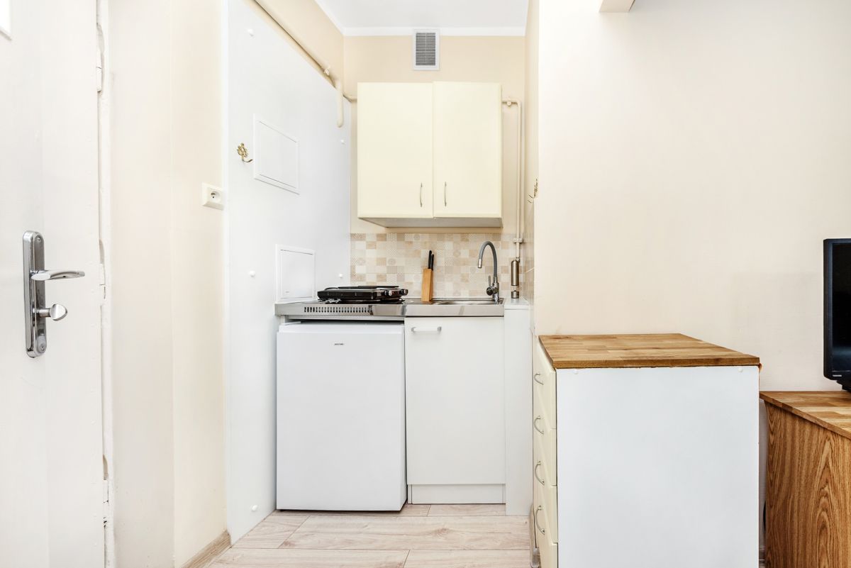 Jeden przestronny pokój, aneks kuchenny w przedpokoju, łazienka z prysznicem.