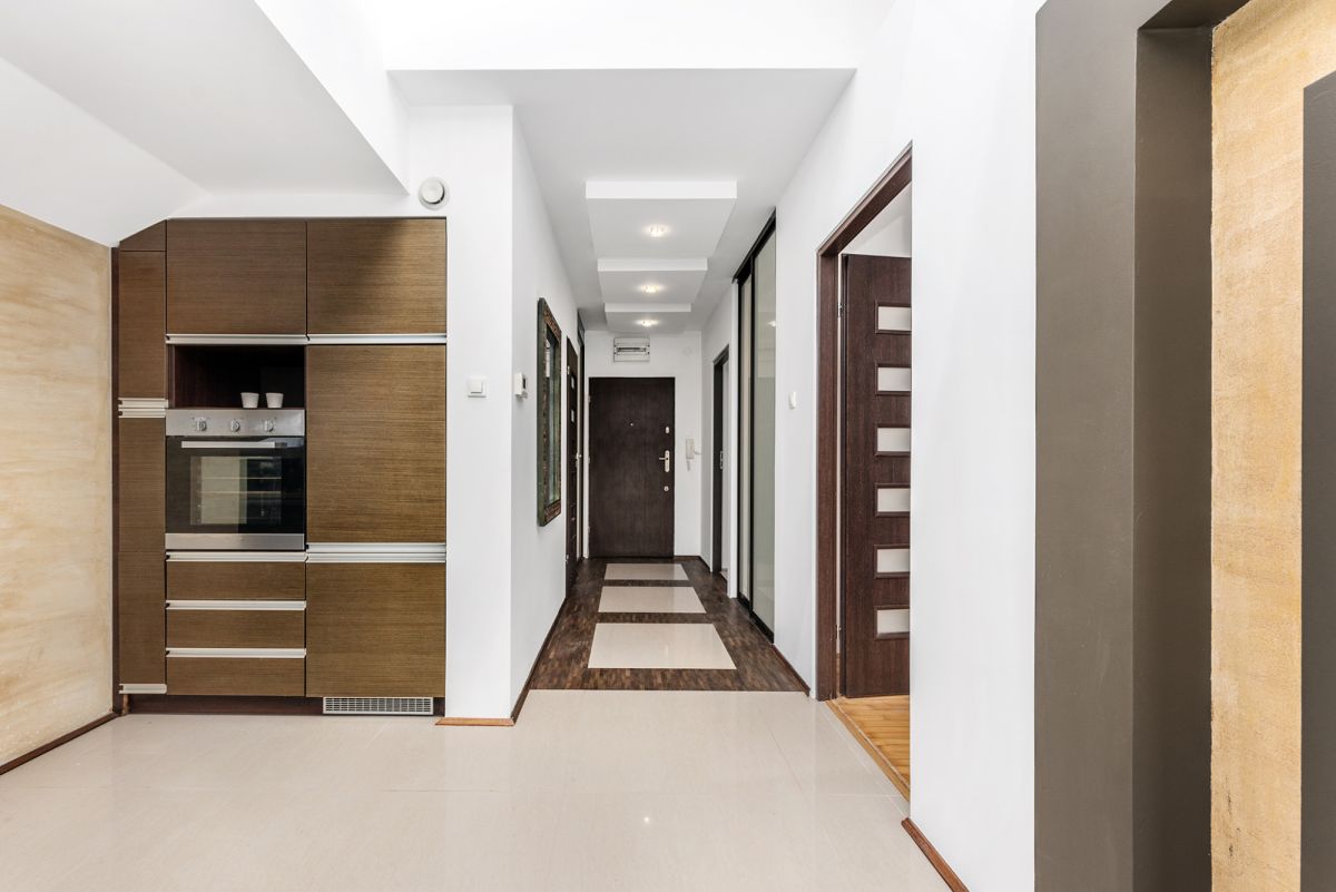 Na podłogach drewniany parkiet i polerowany gres, a w łazience naturalny trawertyn. Dodatkowo, w kuchni i łazience zamontowano ogrzewanie podłogowe, co gwarantuje komfort, zwłaszcza w chłodniejsze dni.