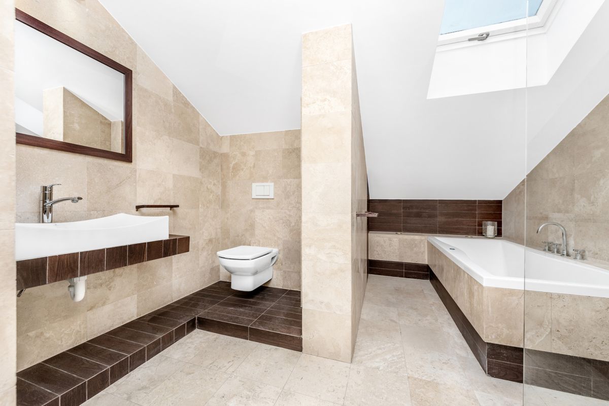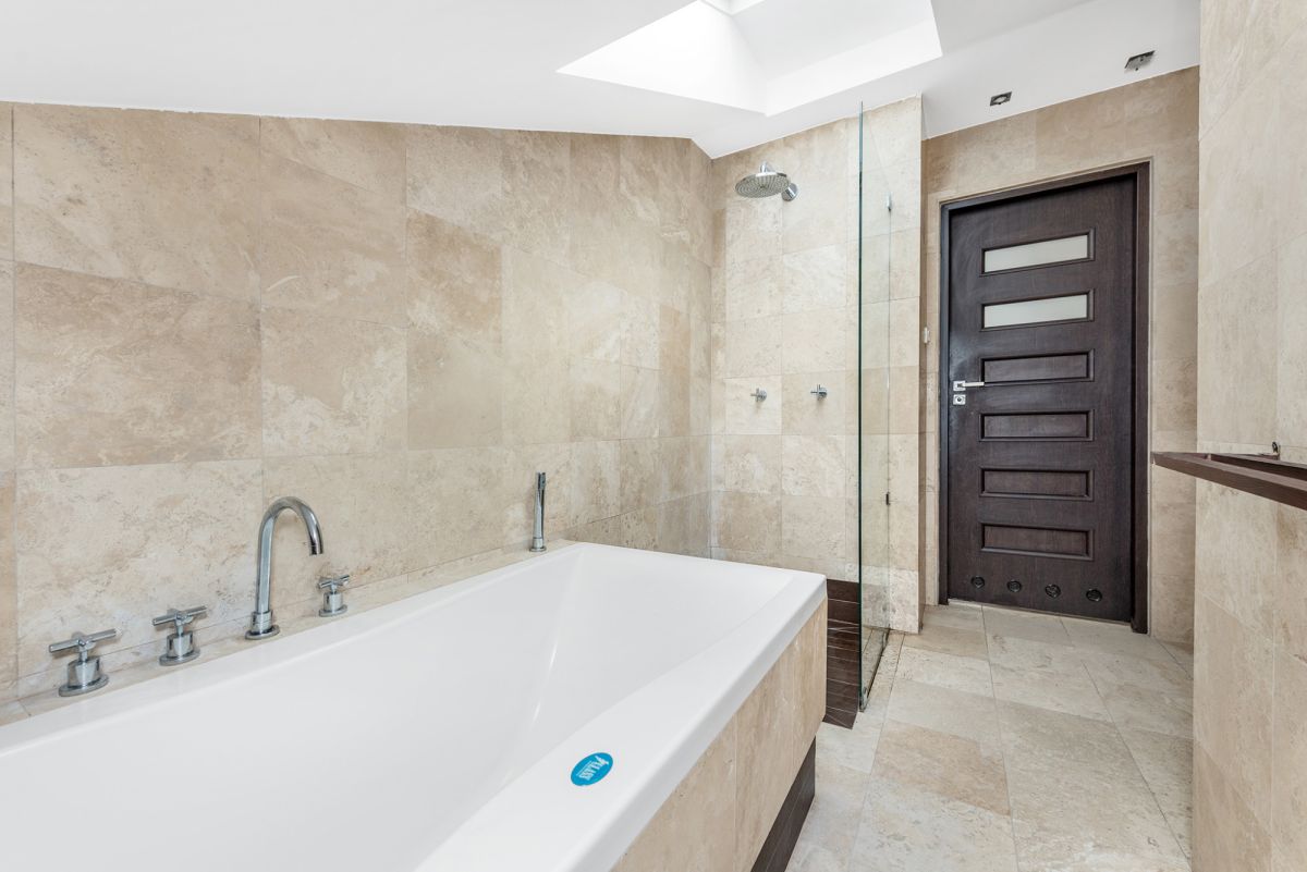 Funkcjonalna łazienka z wanną i kabiną prysznicową.