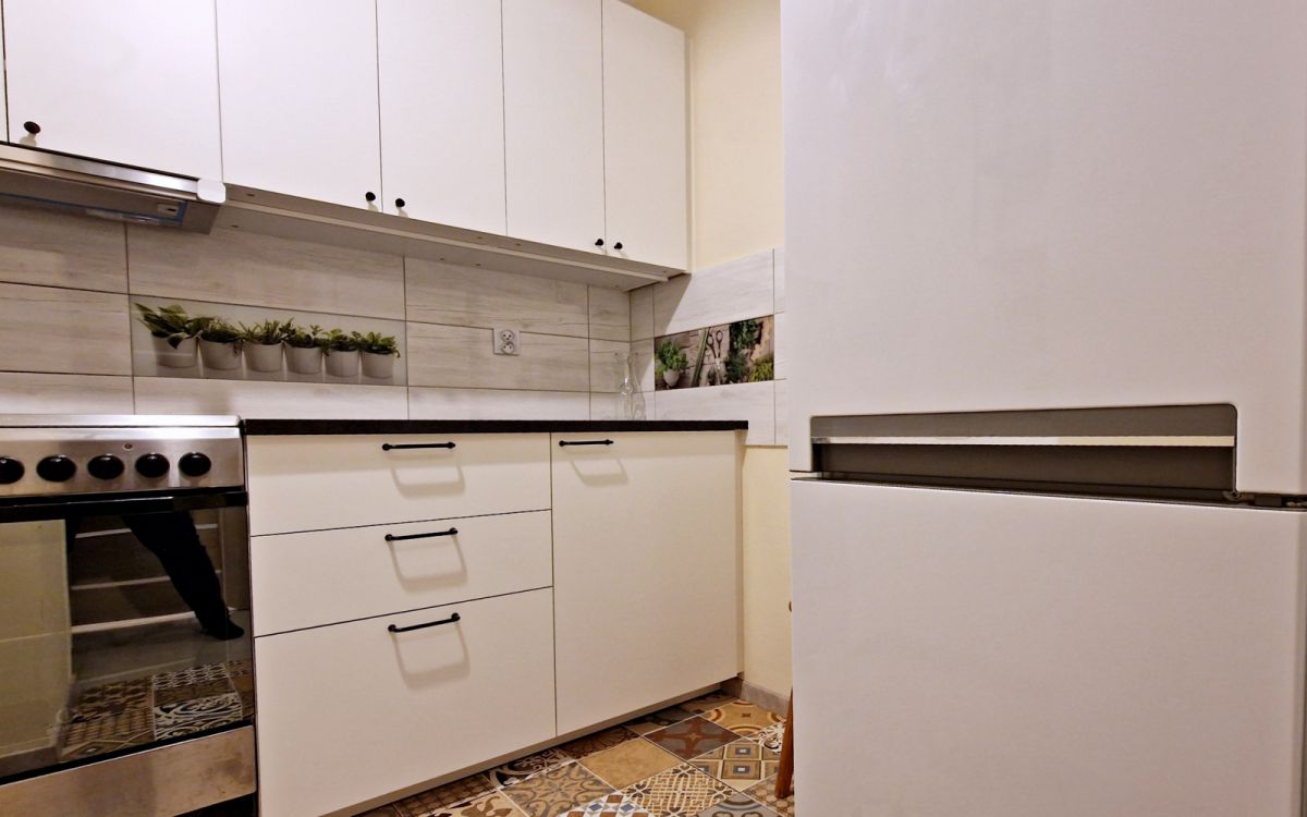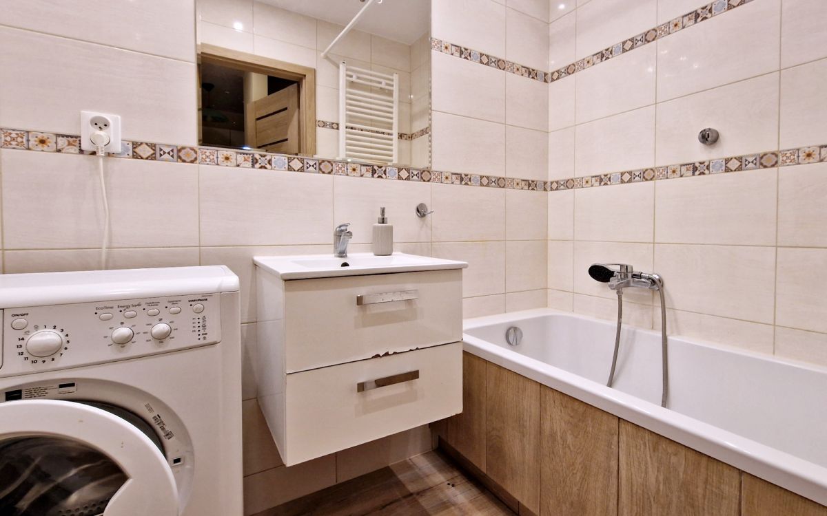 Umeblowanie: sofa narożna, szafa, komoda, stół z krzesłami, meble w kuchni. Sprzęty: lodówka, kuchenka z płytą elektryczna i piekarnikiem, pralka. Wanna z opcja montażu drążka na zasłonę prysznicową.