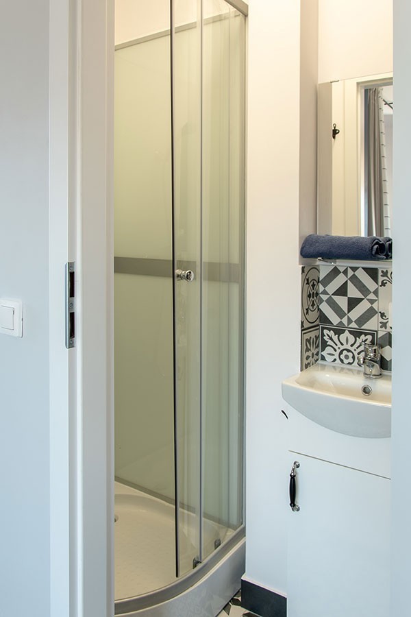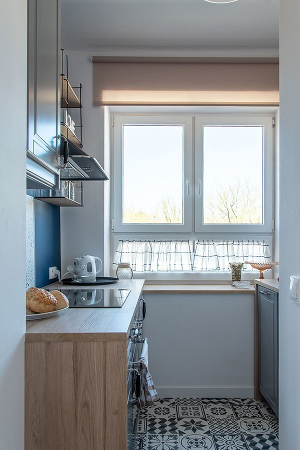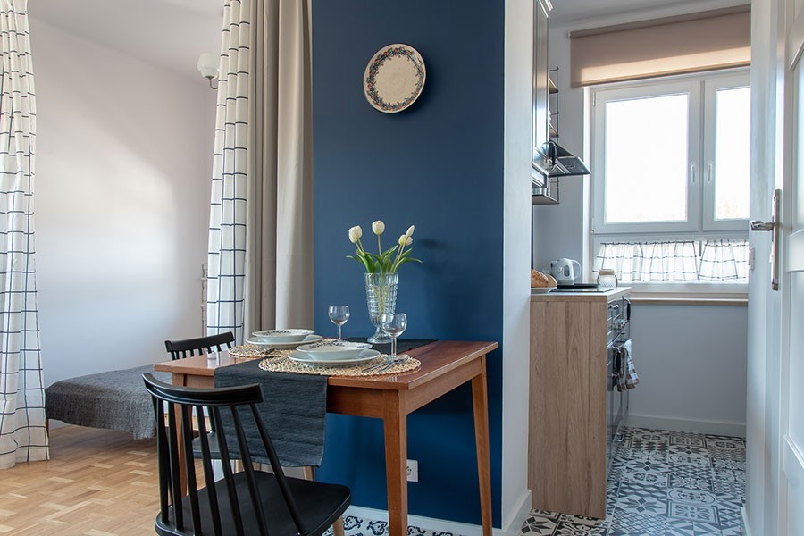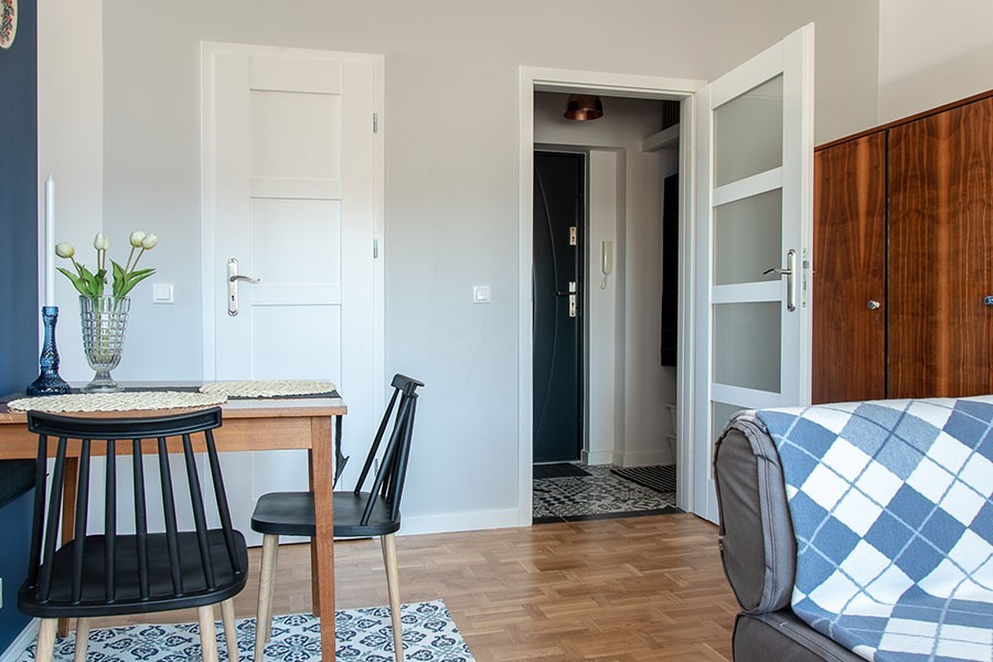 Na 28 metrach mamy funkcjonalny salonik z kanapą i rozkładanym stołem, widną sypialnię z porządnym, dwuosobowym łóżkiem, widną kuchnię z 2 blatami, zmywarką, piekarnikiem i czteropalnikową kuchenką, a do tego łazienkę z pełnowymiarowym prysznicem i całkiem spory przedpokój z wnęką.