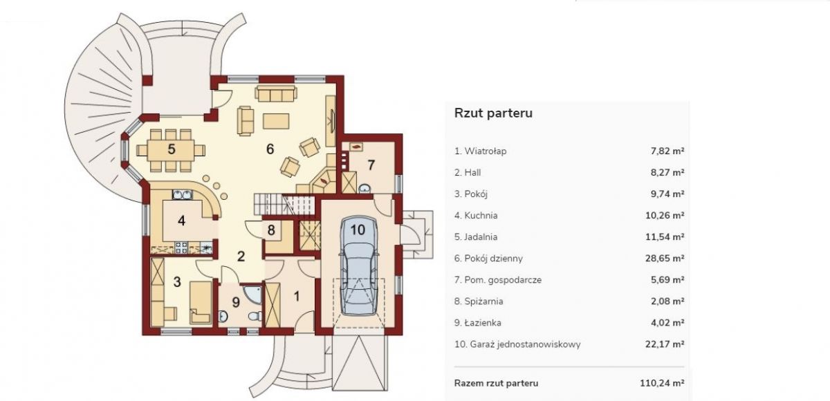 Na parterze łazienka z prysznicem, gabinet/ sypialnia, otwarta przestrzeń z kuchnią, jadalnia, garaż i kotłownia.