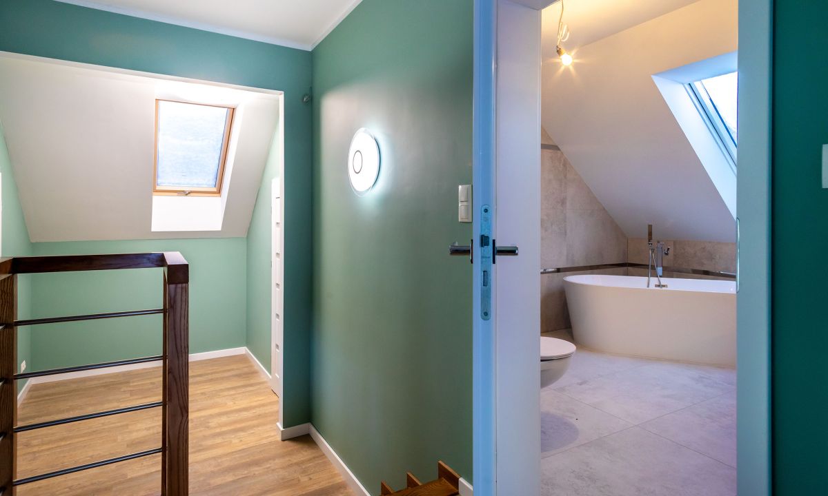 Na poddaszu 3 sypialnie, łazienka z wanną i prysznicem, 2 garderoby, pralnia.