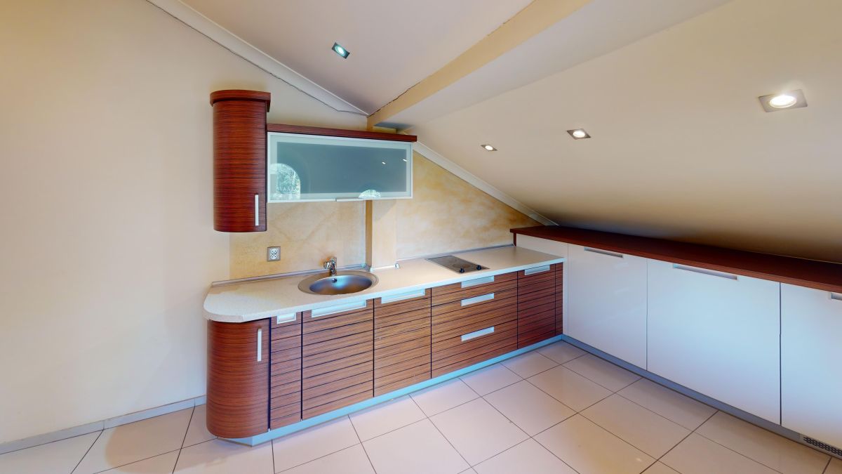 Piętro oferuje prywatną strefę domowników: cztery sypialnie, pokój kąpielowy oraz dodatkową kuchnię z wyjściem na balkon.