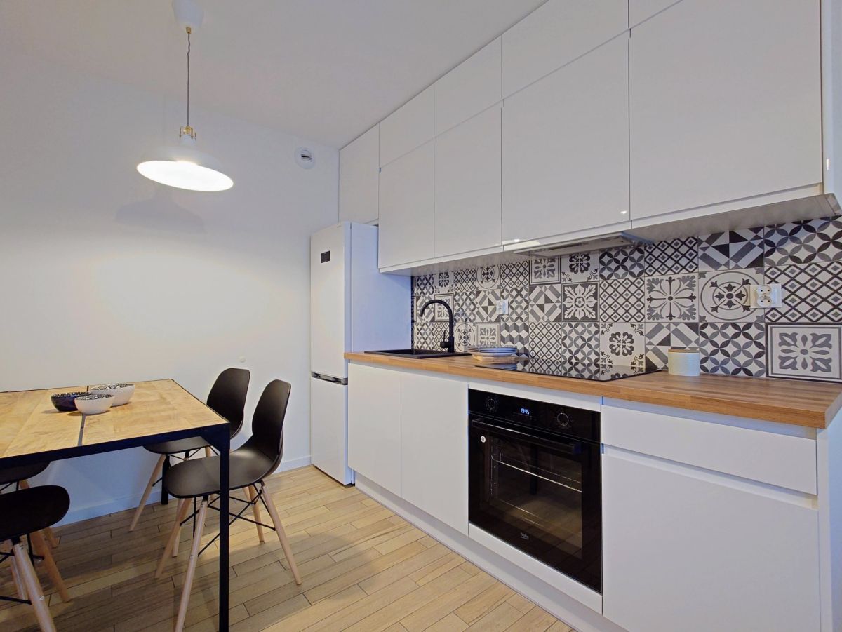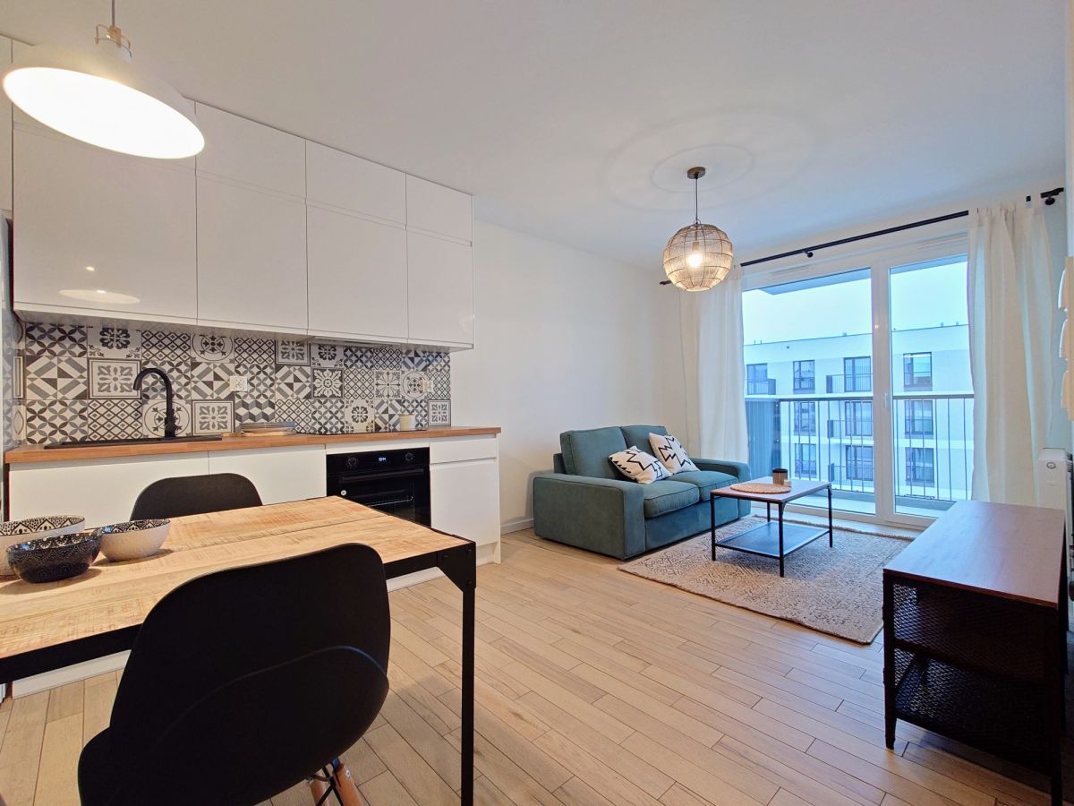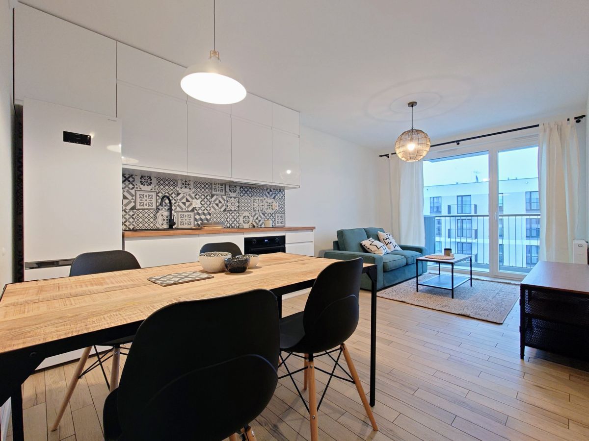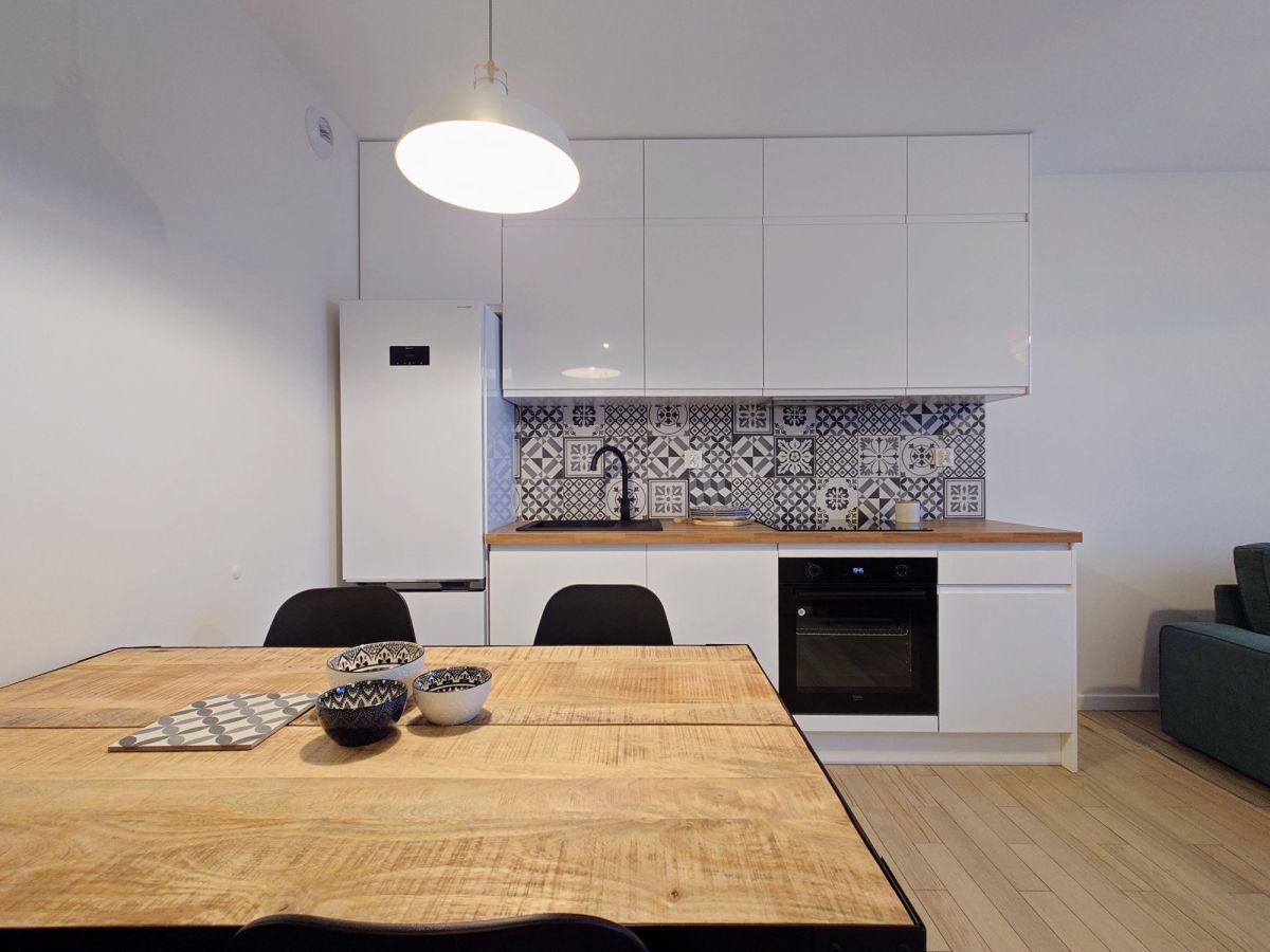Urządzone jak na zdjęciach, wyposażone w niezbedne sprzety (pralka, lodówka, zmywarka, płyta indukcyjna, piekarnik). W sypialni jest łóżko z materacem. Okna na wschód, duży balkon z widokiem na Kraków. Ogrzewanie i ciepła woda z sieci MPEC. nie ma gazu. Miejsce parkingowe w garażu podziemnym.