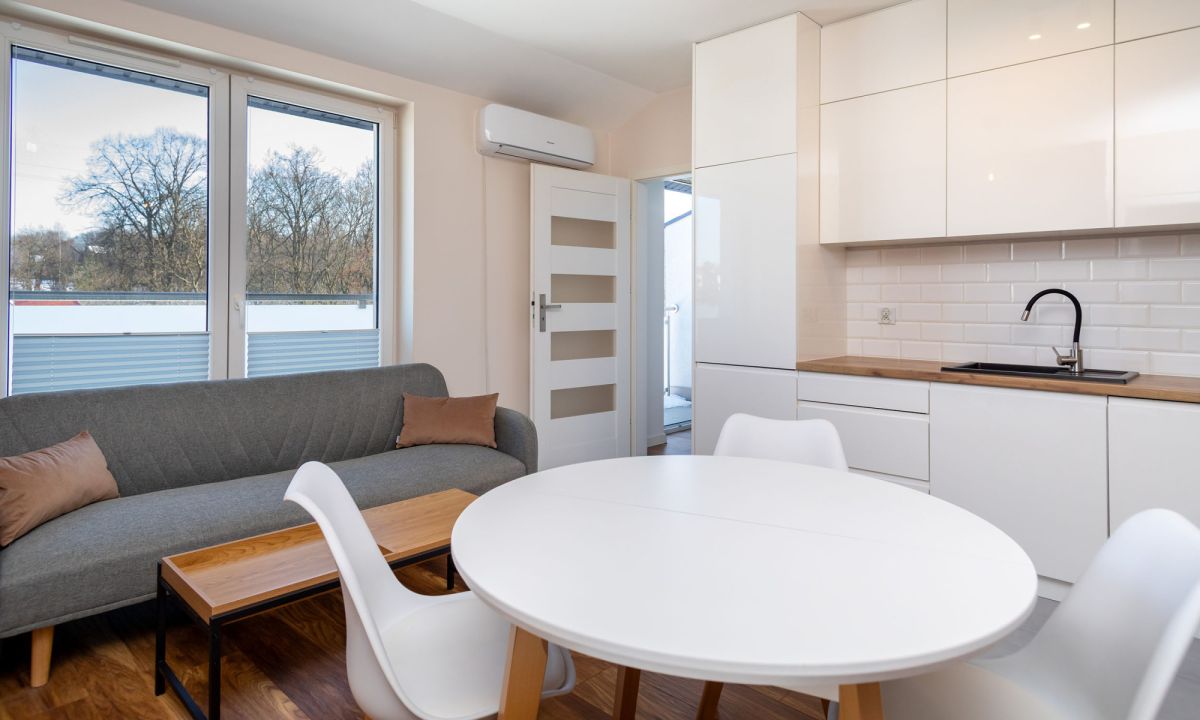 2 sypialnie lub sypialnia i gabinet z balkonem, salon z aneksem, nowoczesny wystrój.